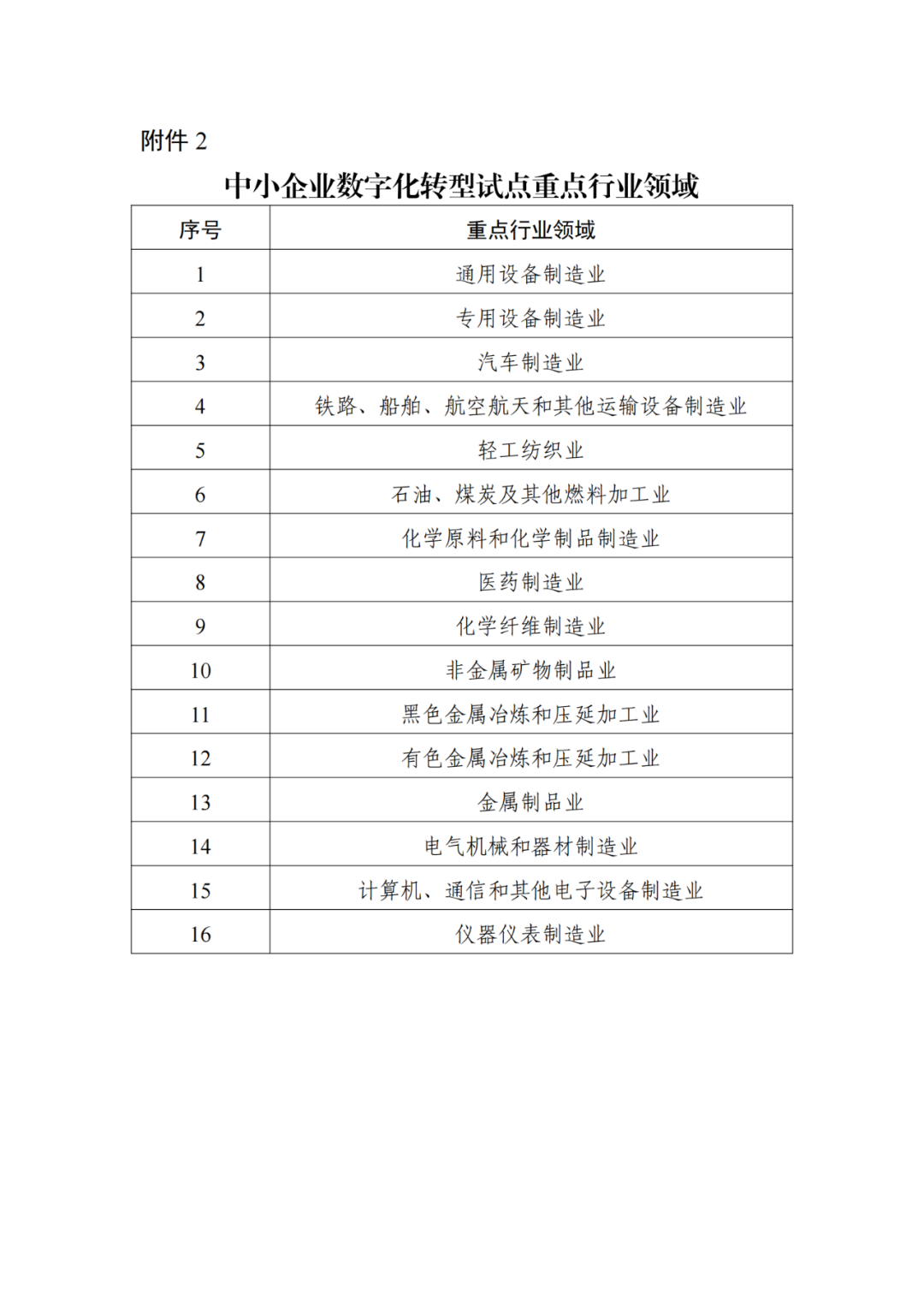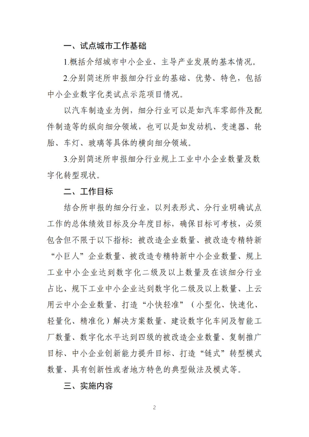 (一)聚焦重点行业。试点城市应将制造业关键领域的中小企业作为数字化转型试点的重点方向,可在重点行业领域(见附件2)中进一步确定具体细分行业开展试点,选取的细分行业应符合国家区域战略发展规划和产业导向,体现自身产业基础和特色优势,具有产值规模较大、中小企业集聚度较高的特征,避免分散。要结合不同行业特点,深入梳理行业共性改造需求,分业分级推进试点企业的数字化改造。