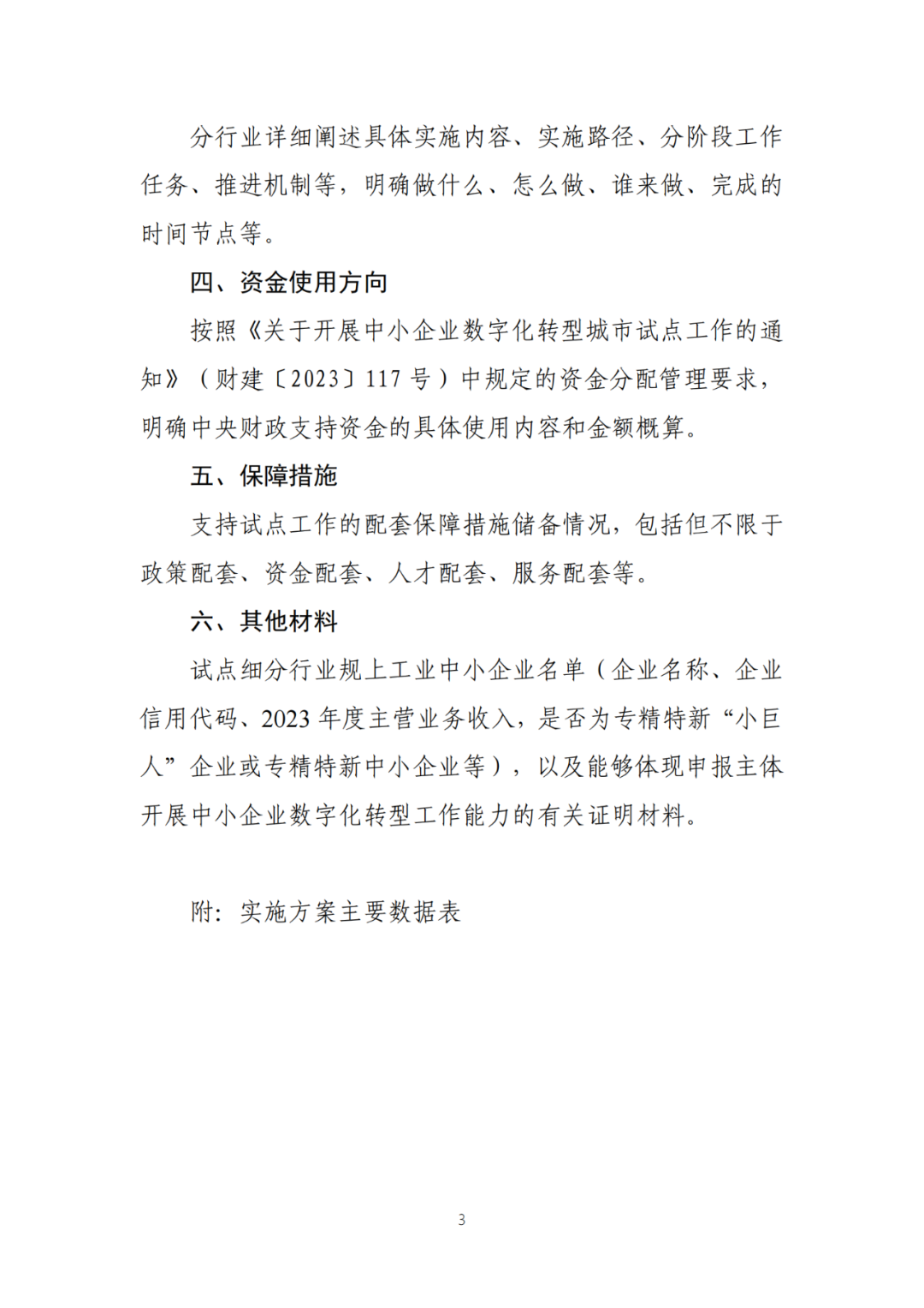 为深入贯彻落实党中央、国务院决策部署,进一步做好中小企业数字化转型城市试点工作,加快发展新质生产力,根据《关于开展中小企业数字化转型城市试点工作的通知》(财建〔2023〕117号,以下简称《通知》)要求,现就2024年中小企业数字化转型城市试点申报工作有关事项通知如下: