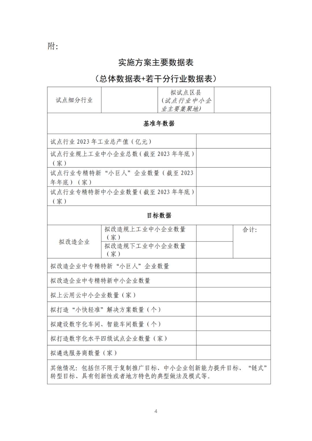 (二)聚焦重点企业。试点城市要在确定的细分行业中,选择处于产业链关键环节的中小企业作为本次数字化改造的重点对象,要优先将专精特新中小企业和规上工业中小企业纳入改造范围。重点推动企业开展生产过程、产品生命周期和产业链供应链等关键业务环节的深度数字化改造,推进数据采集、场景集成和系统互联互通。注重推进人工智能大模型、大数据、区块链等技术在研发设计、视觉质检、参数优化、能耗管理、智能分拣等场景中的应用。东中西部被改造企业数量及改造后应达到的数字化水平按照《通知》执行。